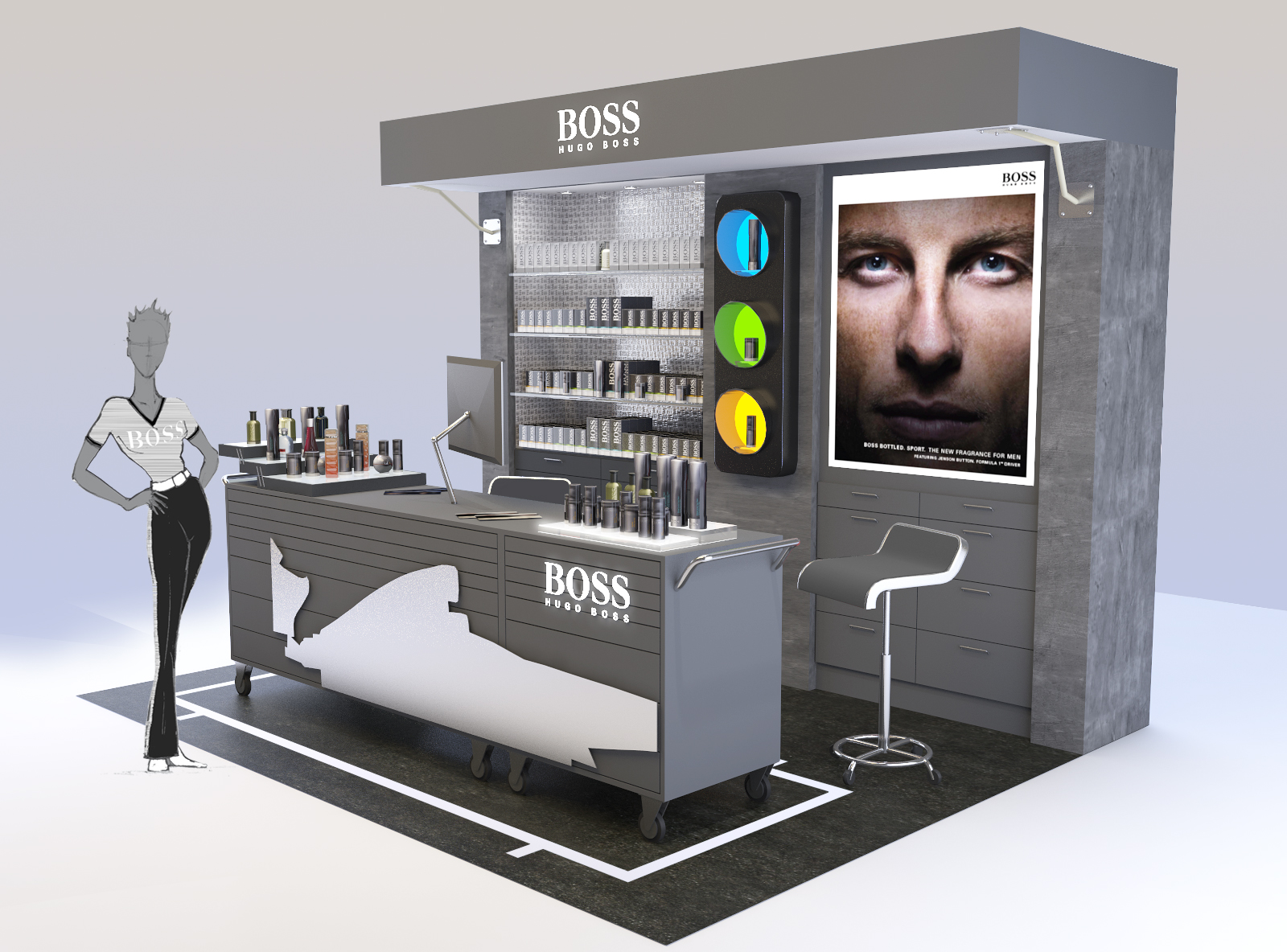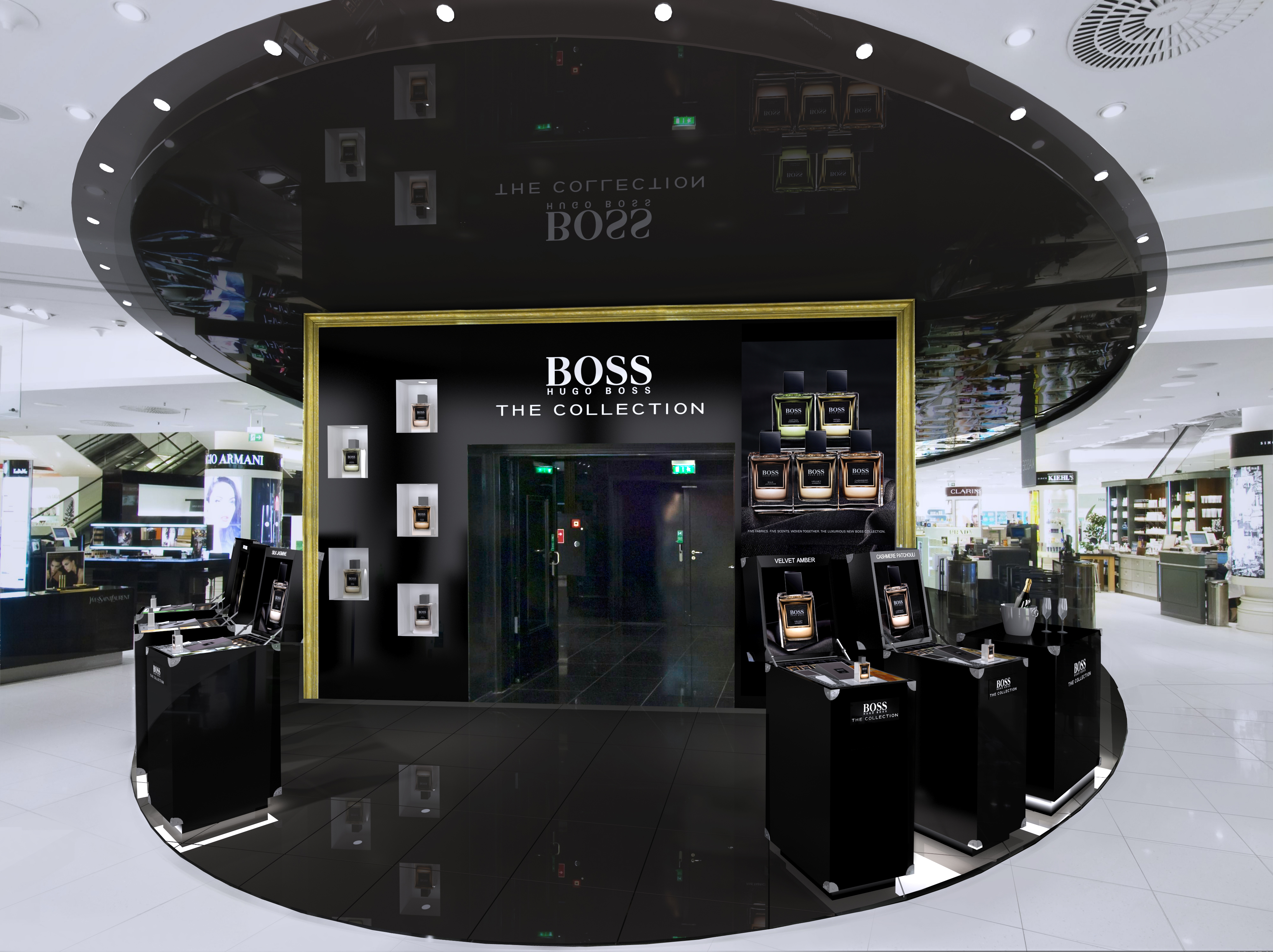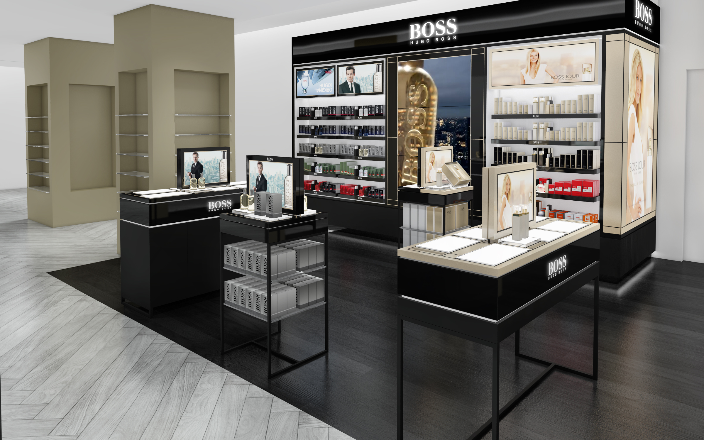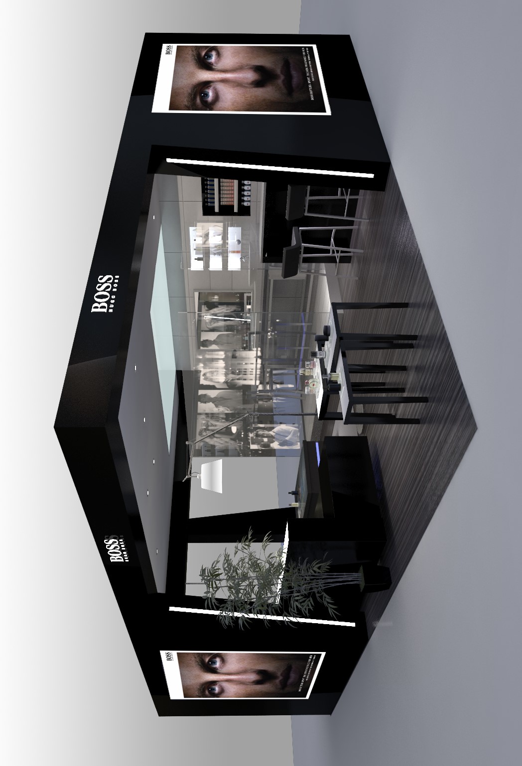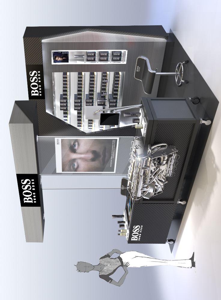 The 3D images showcase a series of stand and boutique concepts dedicated to the HUGO BOSS brand. The structures incorporate luminous elements and striking visual displays that highlight the brand’s key products.