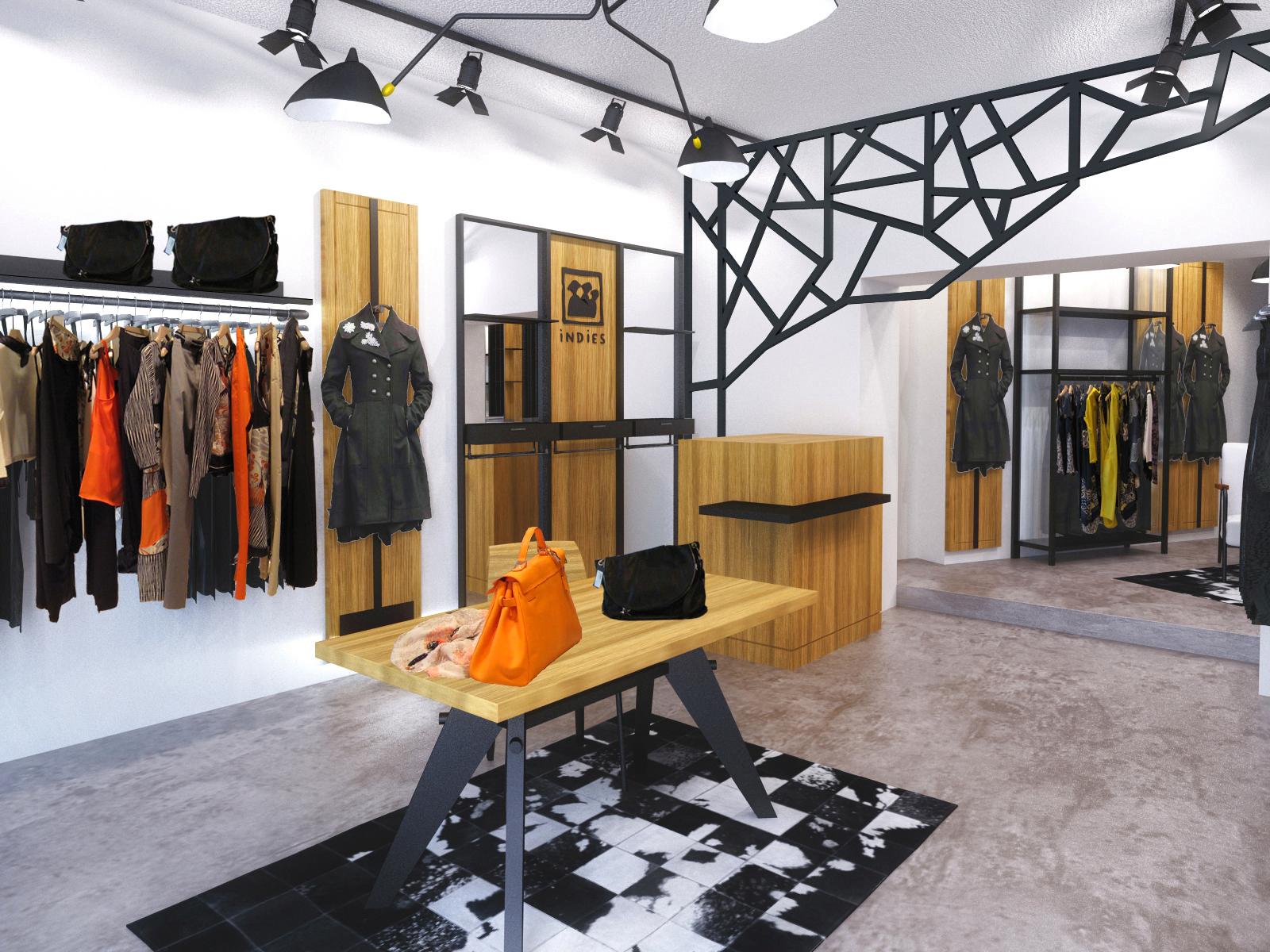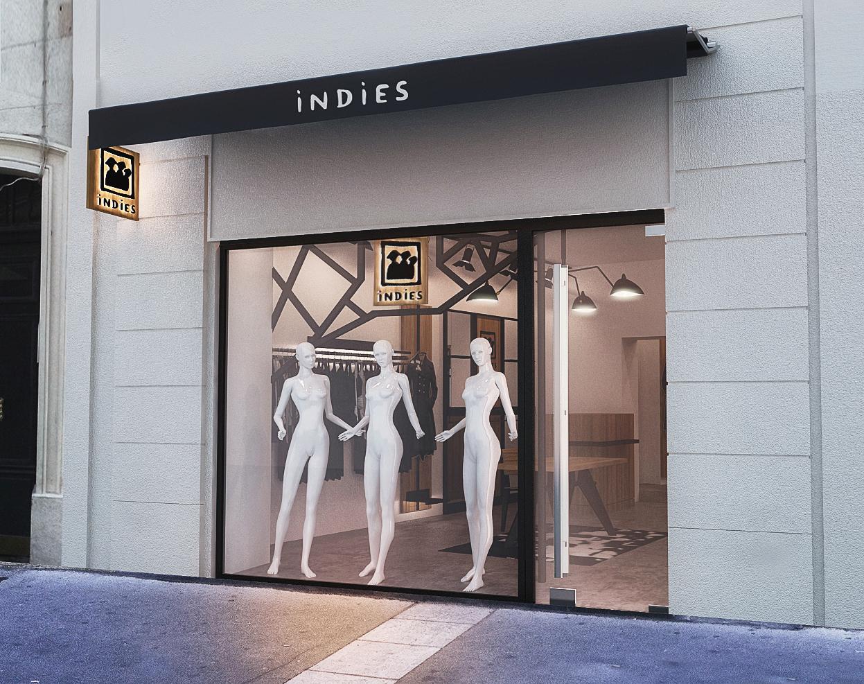 The INDiES brand showcases a modern, minimalist aesthetic with neutral tones and floral patterns. Subtle lighting and minimalist furniture enhance the chic and accessible atmosphere.